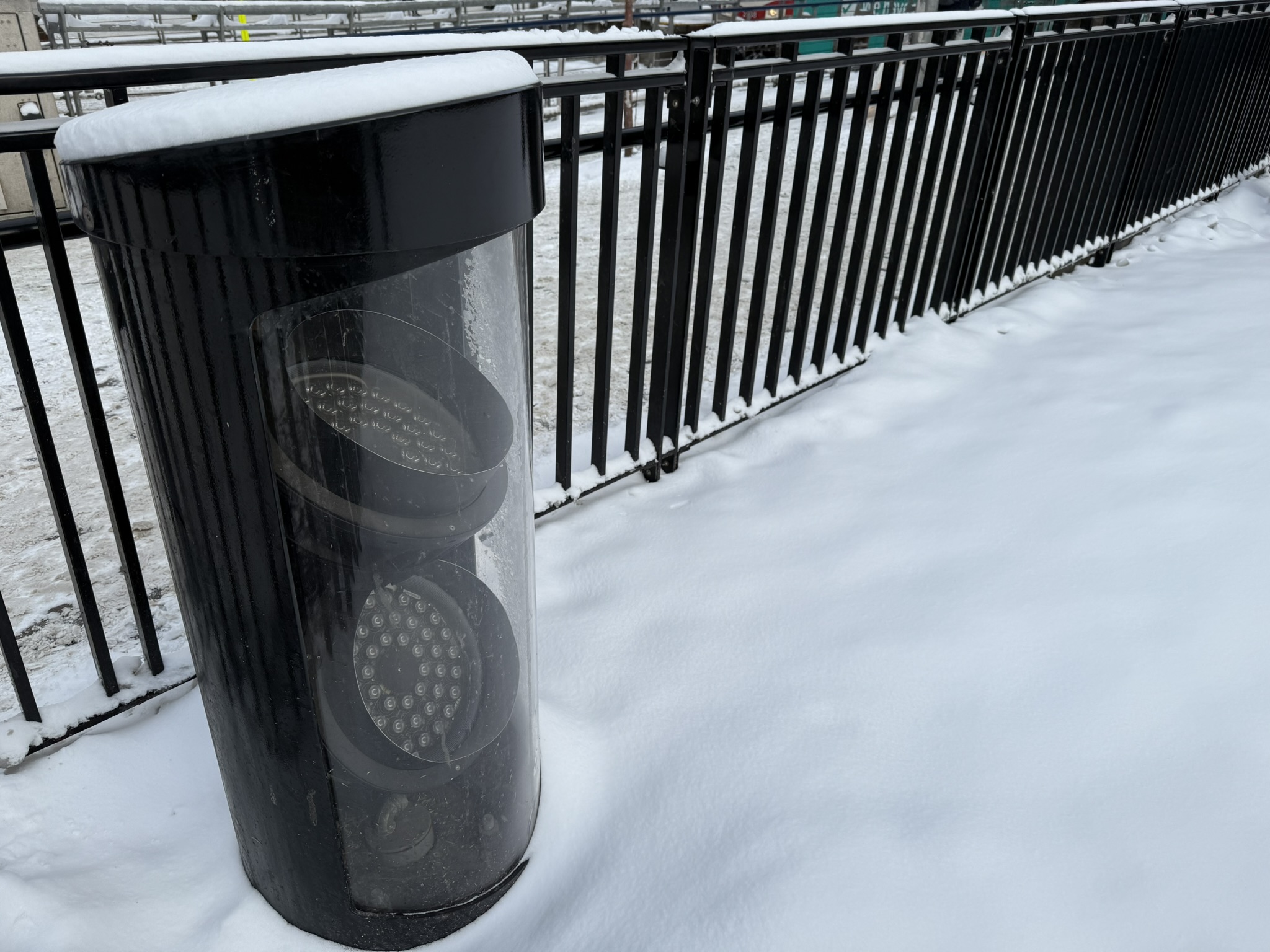 - Custom bollards protect luminaires and maintain aiming in a busy urban site and a snowy climate, reducing maintenance burden on the building owner.